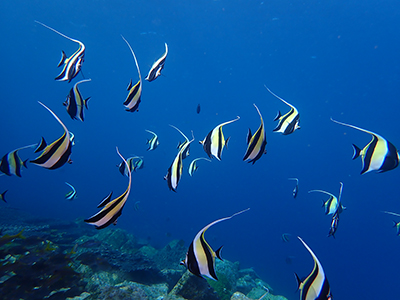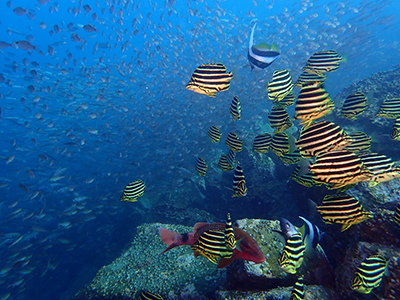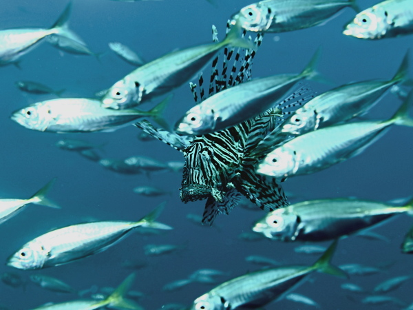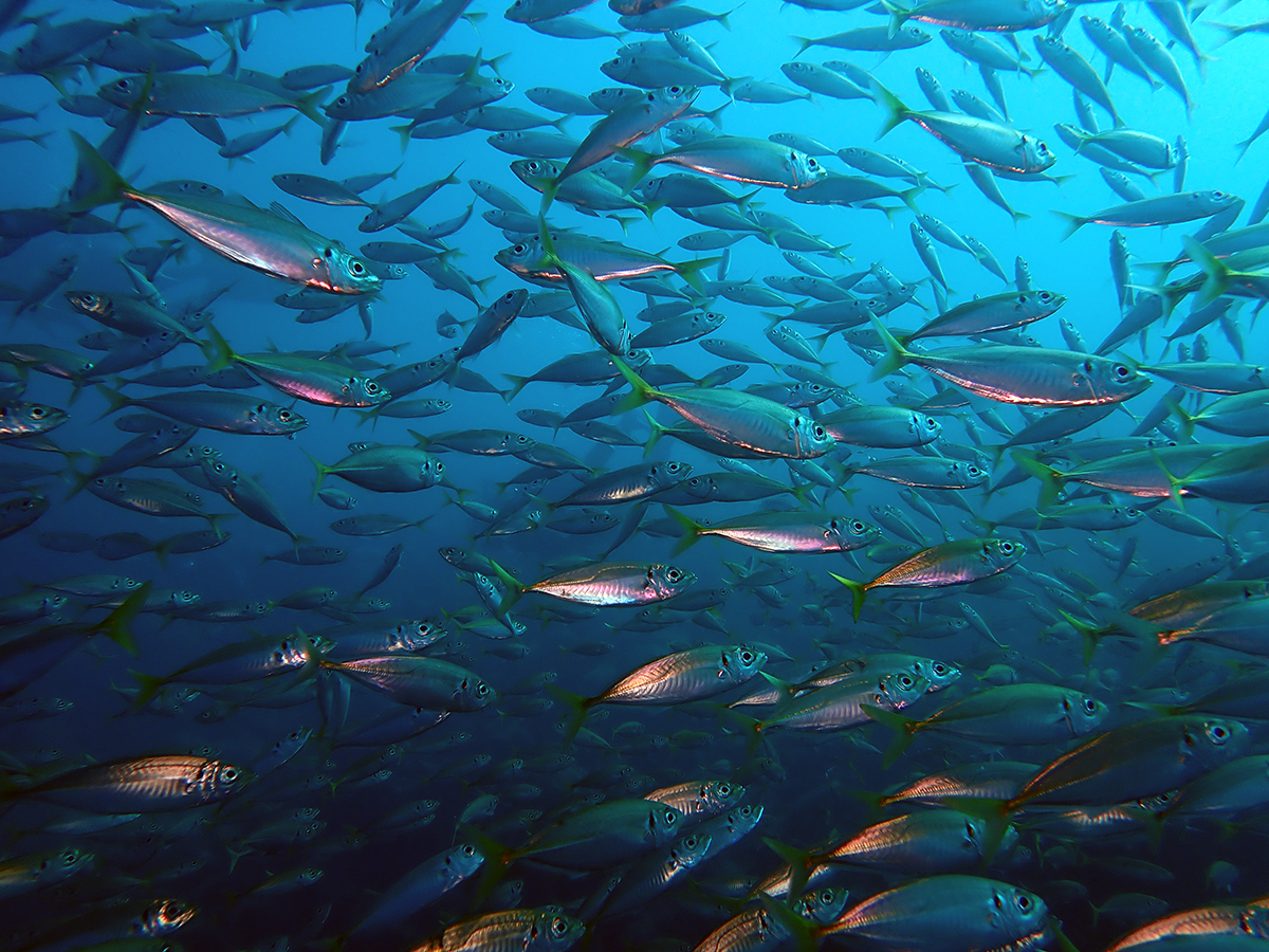 特に中層に塊となっているメアジ、そして突然パニックになり逃げまくる激しい動きは見もの。