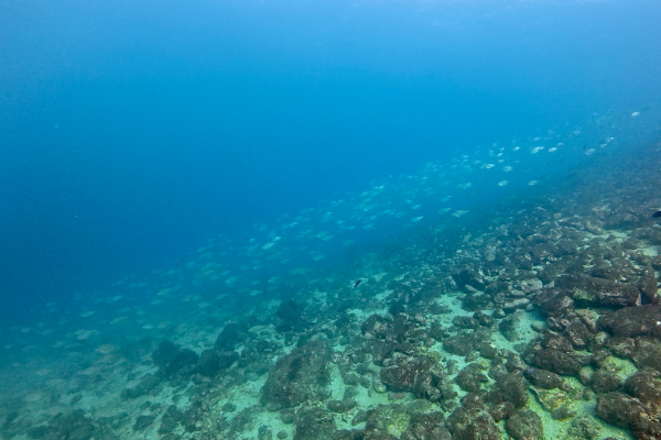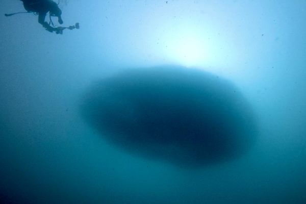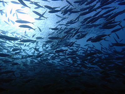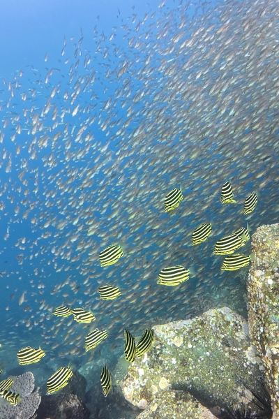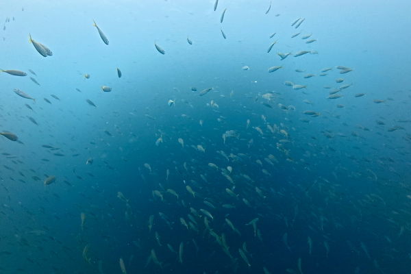 深場から敷石へ向かって移動中、急に薄暗くなったと思えば、上空は陽光を遮るメアジの巨大玉。