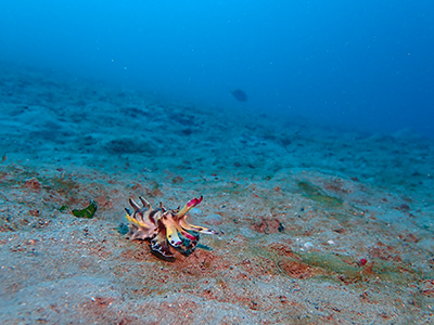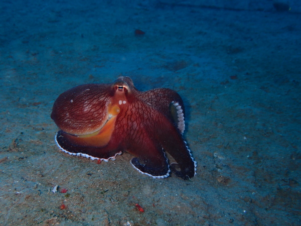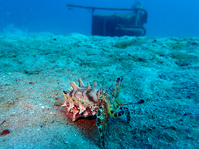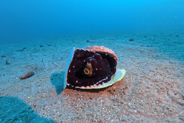器用に貝殻を数枚持ちながら移動するメジロダコ