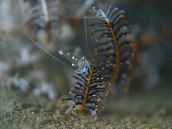 『内浦ビーチ』 モヨウフグ若魚をクリーニングするオドリカクレエビ