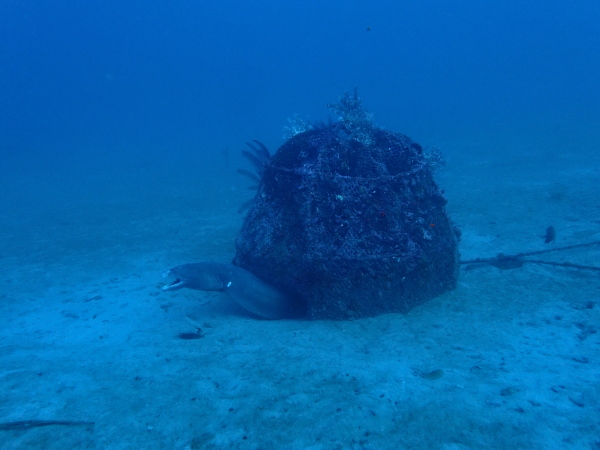 【内浦ビーチ】オナガウツボ -26m丸カゴに時々戻ってきてくれます。
