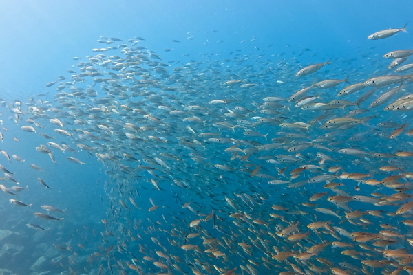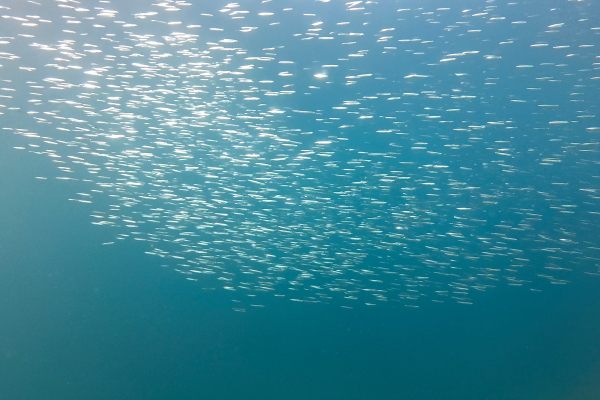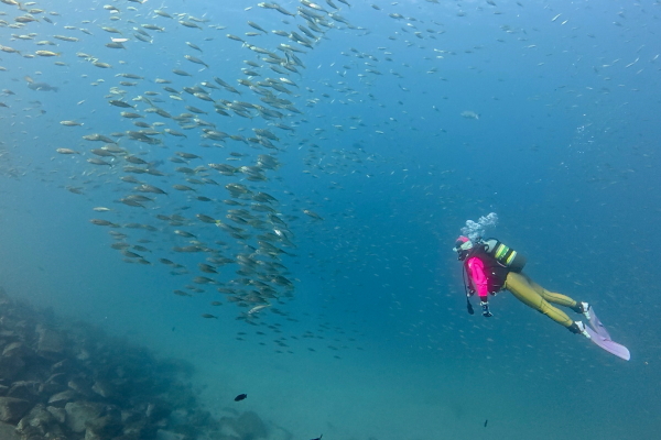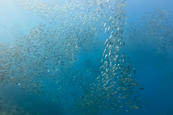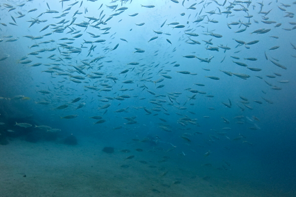 やや白さがある水中でした。アジ達はどんどん増え続け、織りなす群れの無限の形、これを見ているだけでいい。