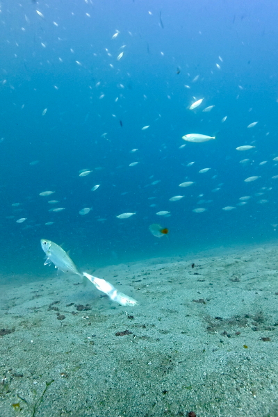 内浦ビーチ、敷石エリア魚影は今期最高潮をむかえています。クロホシイシモチ大群、マアジ大群、メアジ大群 捕食魚ブリ編隊、砂地のダイナンウミヘビがミサイルのように飛び出し、魚を捕えます。