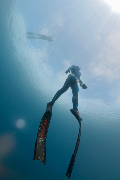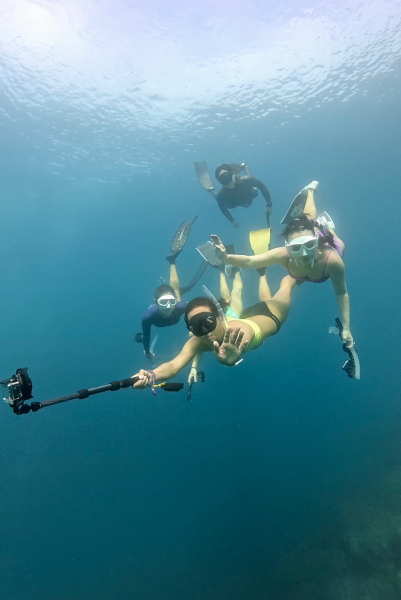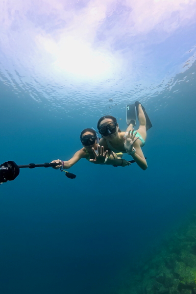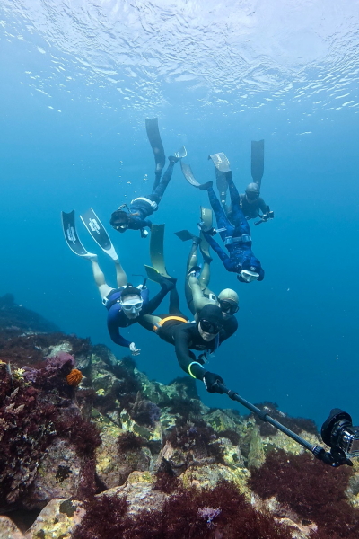 周囲のドライスーツダイバーの怪訝な?驚きの目を浴びながら薄手のウエットで飛び込む彼女たち。一緒に遊んでいただきました。
