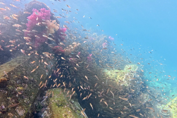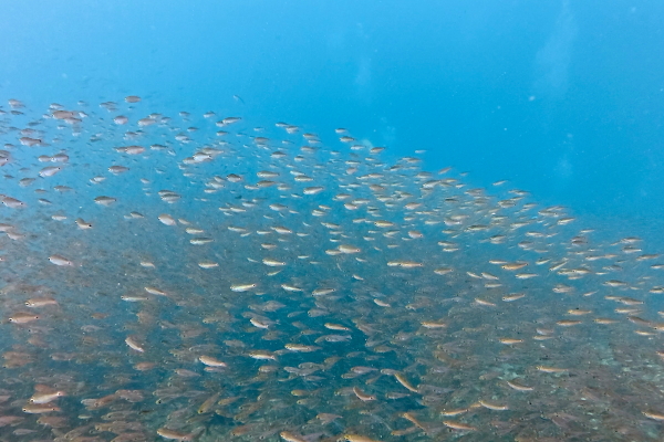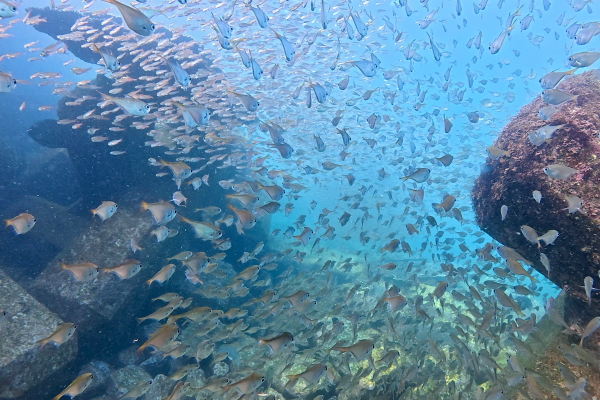 マアジ大群は密集度高く、向こう側のゲストを見失うほど。ワイド撮影はここでキリがないほど楽しめます。