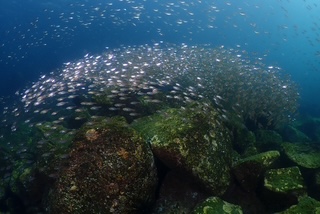消波ブロック沿いは魚群がほんとに見もの。このエリアを見逃さないで。 ミズホハタンポ群れ