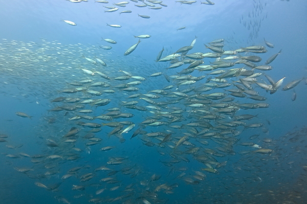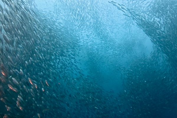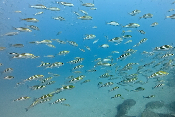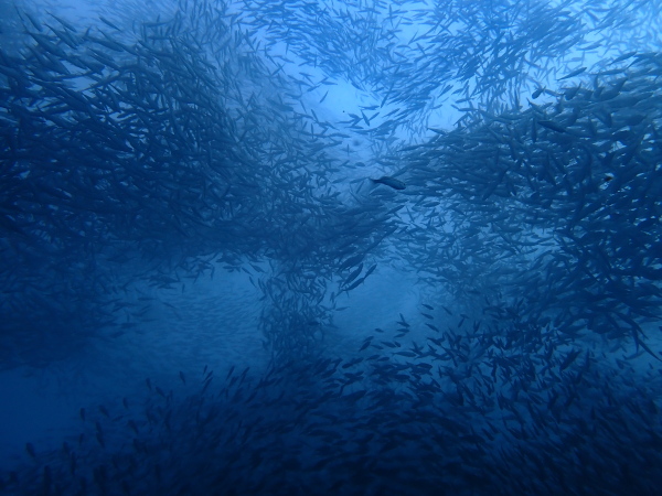 やや白さがある水中でした。アジ達はどんどん増え続け、織りなす群れの無限の形、これを見ているだけでいい。