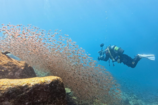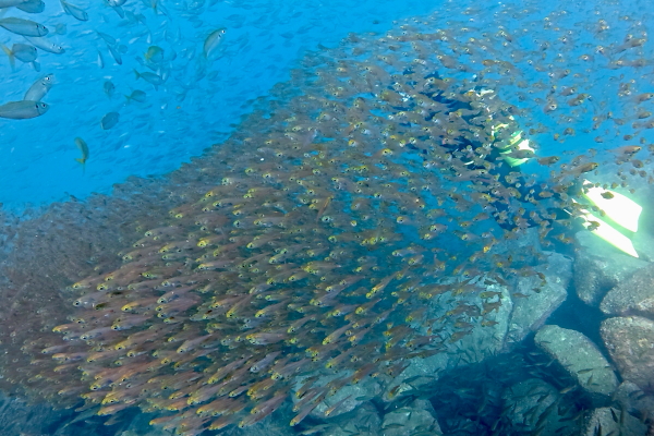 そのうねりの影響で透視度はダウン。浅場は魚がてんこ盛り。飛び込んですぐにこの魚影はホントに凄い。