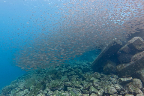 浅い岩場は視界5mほど。敷石エリアはクロホシイシモチ大群など魚影濃し。